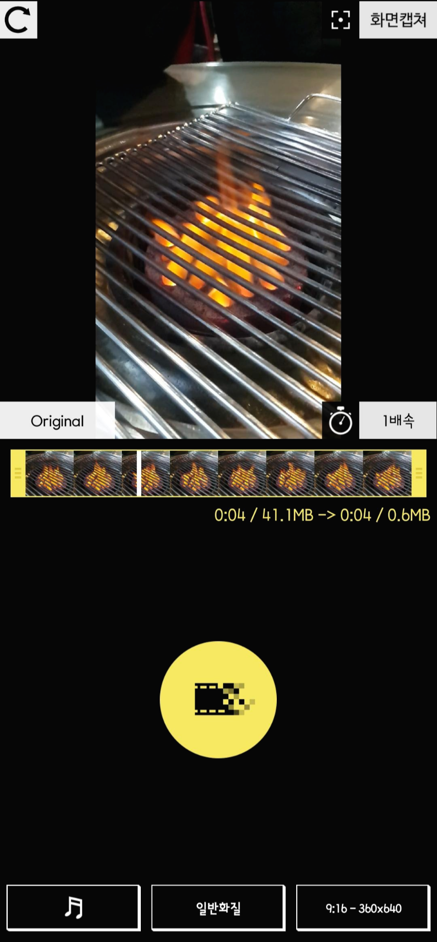 원하는 간단 편집이 끝나면 해상도 선택후 첫 사진의 필름모양 노란 버튼을 누르면 변환이 시작이 됩니다. 용량이 큰 파일인 경우에는 생각보다 시간이 걸리는 것 같습니다. (1기가 기준 약 5~10분) 그리고 변환하는 동안 다른 동작을 하시면 자동으로 멈춘다거나 하는 경우가 많기 때문에 변환을 누른 이후에는 그 상태 그대로 가만히 두는게 좋은 것 같습니다.
