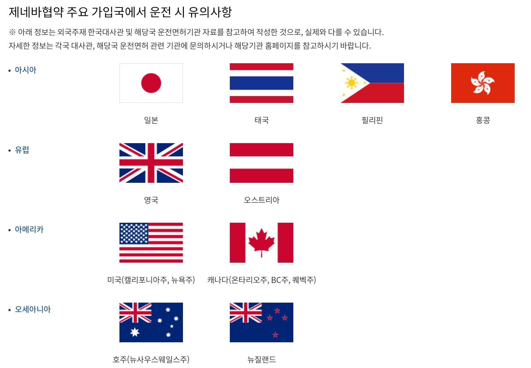 나라마다 도로교통법이 다 다르기 때문에 방문하는 나라에 따라 주의를 요구하는 사항도 홈페이지에서 알려주고 있으니 참고해주시길 바랍니다.