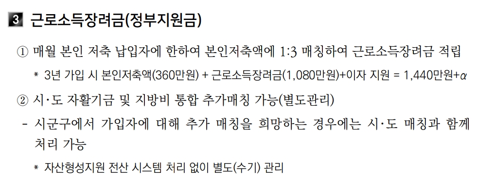 요건을 충족할 시 1:3 매칭하여 근로소득장려금을 국가에서 적립해주는 방식