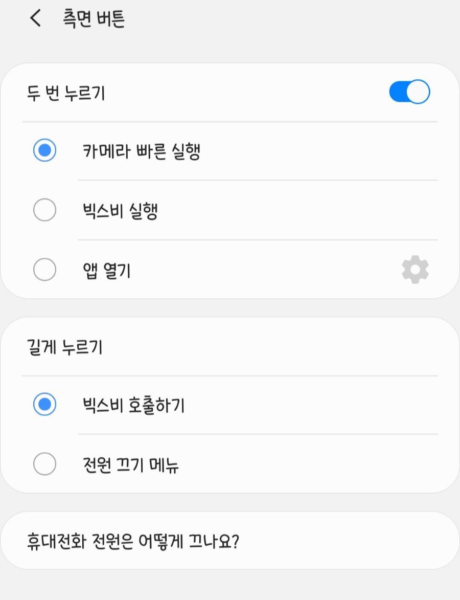 3. 이 곳에서 우측에 위치한 볼륨 버튼 및 전원버튼의 속성을 바꾸실 수가 있는데요, "길게 누르기" 카테고리에서 "빅스비 호출하기"를 "전원끄기" 메뉴로 바꿔주시면 간단하게 빅스비 호출을 막을 수 있습니다.
