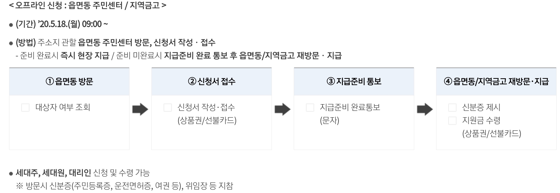 일단 기본적으로 긴급재난지원금은 세대주가 신청하는 것이 원칙입니다. 그러나 행정안전부에서 고지한 바에 따르면 상품권 또는 선불카드를 오프라인(현장 방문)으로 신청하는 경우에는 세대원이나 대리인이 위임장을 지참하여 신청이 가능하다고 나와있습니다.