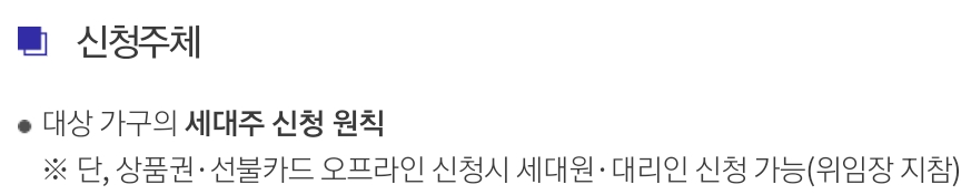 지역사랑상품권 또는 선불카드의 온라인 신청같은 경우에도 세대주 신청과 수령이 원칙적이나 세대원 또는 대리인이 위임장과 신분증을 지참하여 수령이 가능하다고 되어있습니다.