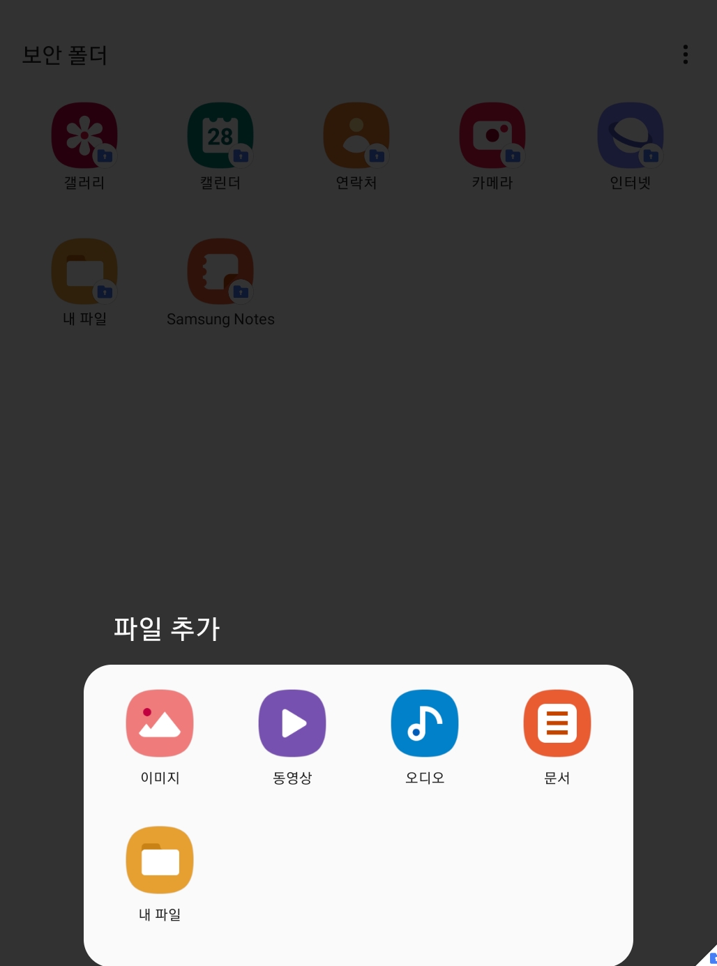 잠금 수단을 입력하고 넘어가시면 다음과 같은 화면이 뜨고 하단의 파일 추가 또는 앱 추가를 눌러서 보안 폴더에 넣고 싶은 파일 또는 앱을 설정하실 수 있습니다. 위에 보시다시피 이미지, 동영상, 오디오, 문서 등등 사용자가 원하는 거의 모든 것을 보안 폴더안에 보관할 수 있습니다.