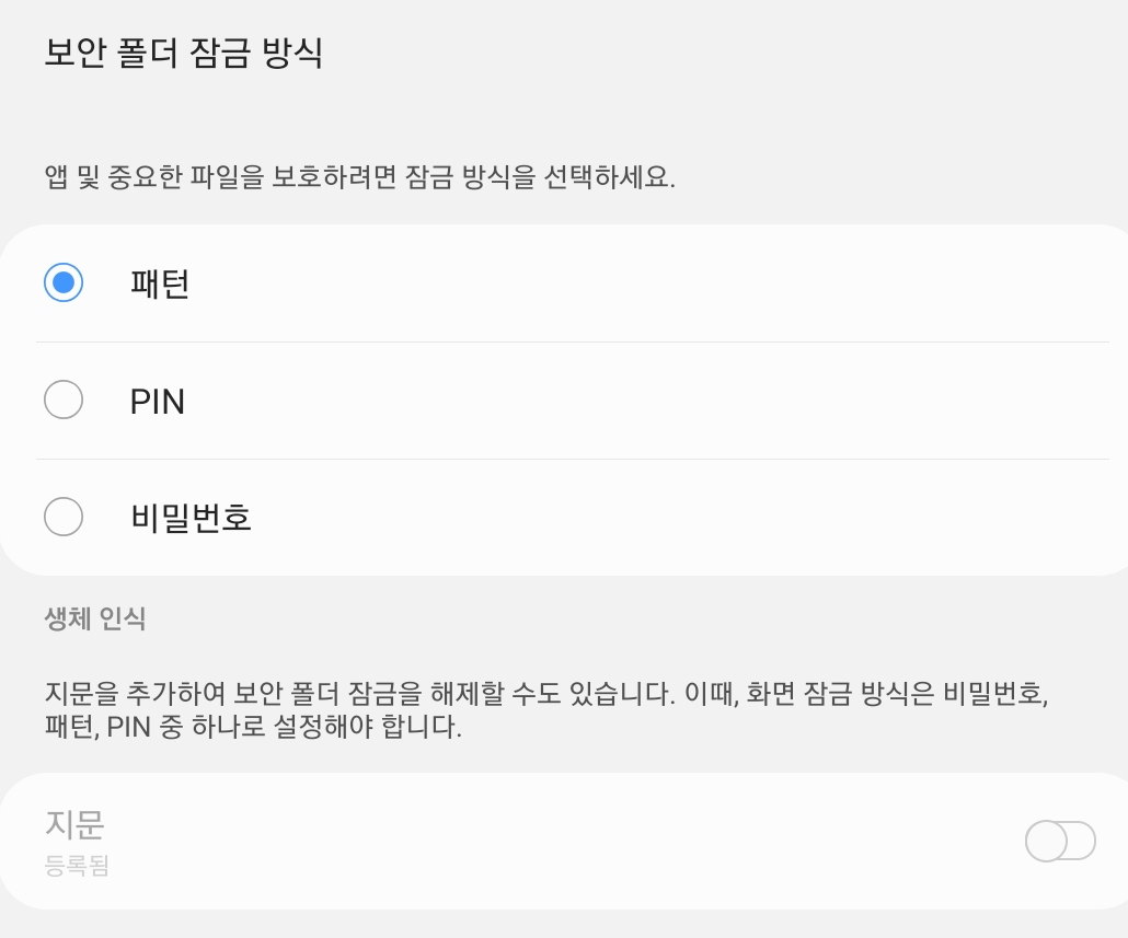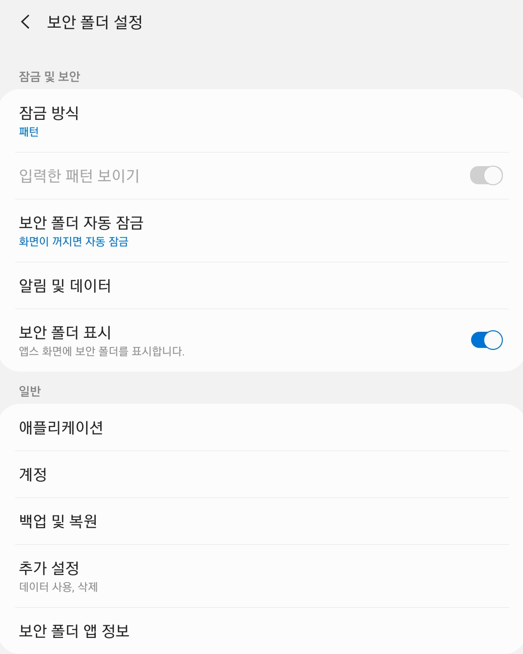 보안폴더 기본 화면에서 우측 상단의 3개의 점이 있는 부분을 눌러서 보안폴더의 설정을 보시면 위와 같은 화면이 나옵니다. 잠금방식을 다른 방식으로 변경을 할 수 있고 보안 폴더가 어느 시점에 자동으로 잠기길 원하는지, 보안 폴더의 표시 여부까지도 설정이 가능합니다.