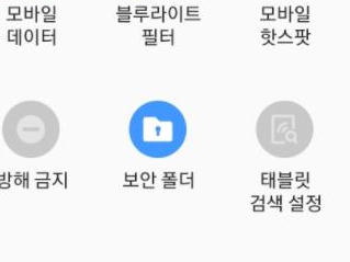 휴대전화 상단의 상태표시줄을 아래로 끌어내리면 볼 수 있는 컨트롤 박스에서 찾아보시면 보안 폴더라는 항목을 찾으실 수 있는데요. 이 버튼을 눌러 활성화 시켜주시면 됩니다.
