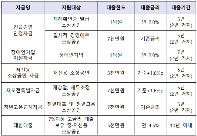 - 재해피해, 금융소외 계층(장애인, 저신용자 등), 경기침체지역, 청년사업자 등에게 경영안정을 위한 자금 지원 - 융자조건