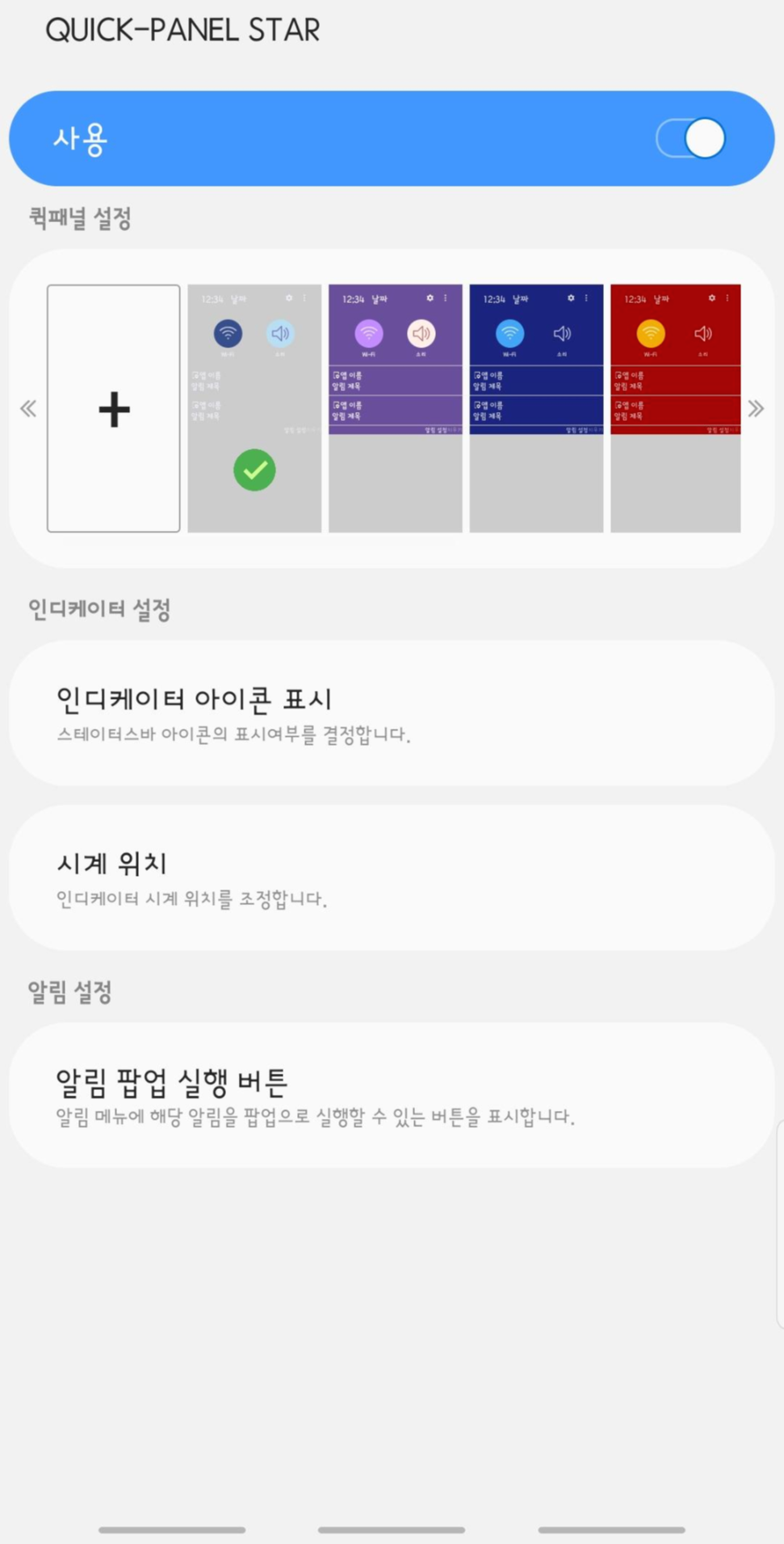 제일 먼저 퀵스타는 휴대전화 맨 윗줄을 아래로 내리면 나오게 되는 퀵 패널에 대한 커스터마이징을 지원합니다. 시계 위치의 조정, 통신사 로고 지우기, 블루투스, 와이파이 등의 인디케이터 표시 여부 등등을 내가 원하는대로 바꿀수 있는 기능을 지원합니다. 또 퀵패널의 배경 색상이나 테마등도 지정이 가능하기 때문에 나의 개성이 맞게 바꿀 수 있는 장점이 있습니다.