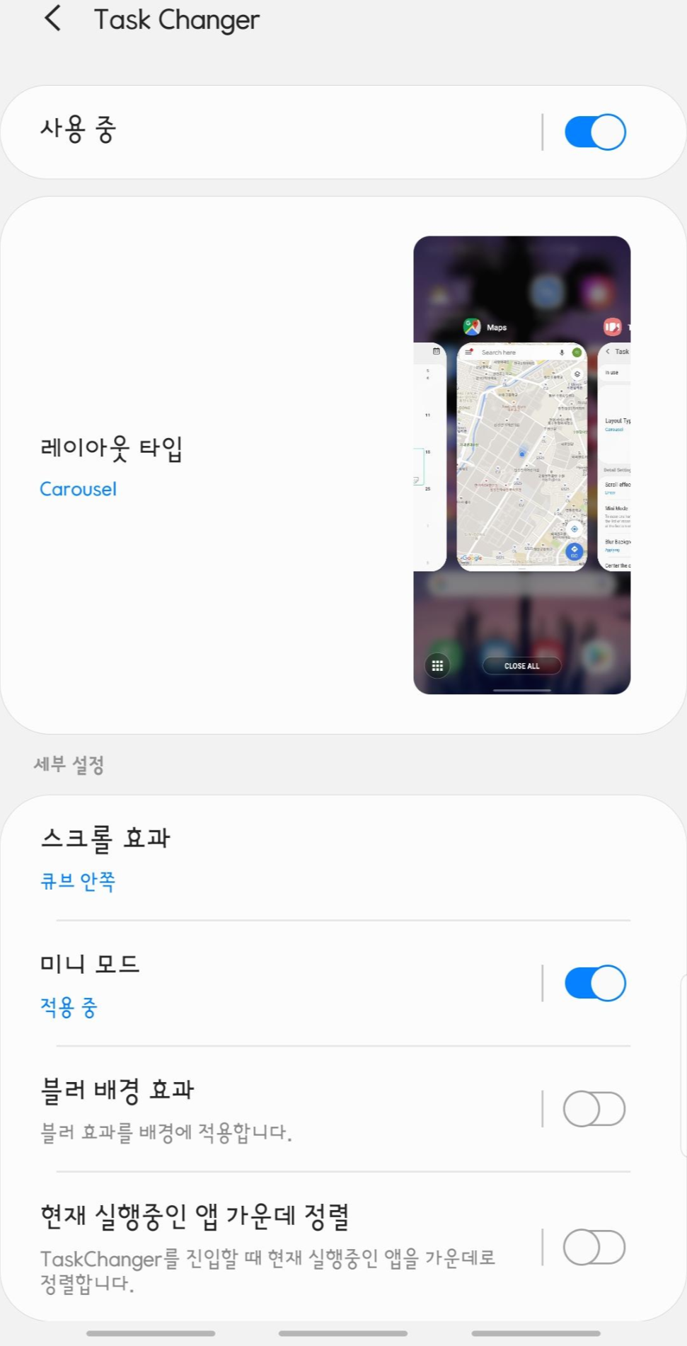 다음으로 태스크 체인저입니다. 태스크 체인저는 하단의 네비게이션 바 맨 좌측버튼의 기능으로 현재 내가 띄워놓은 앱들을 확인할 때 사용하게 되는데 이 앱에서 그 디자인을 변경하고 내가 선호하는 것으로 바꿀 수 있습니다.