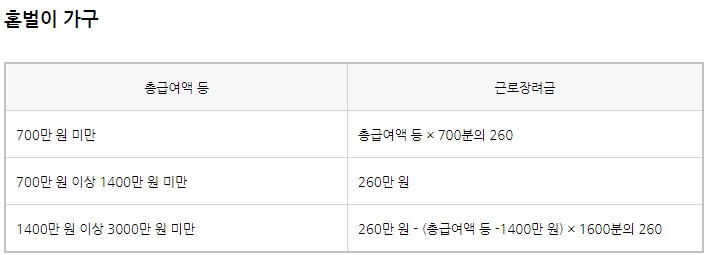 홑벌이가구 : 배우자의 총 급여액이 300만원 미만인 가구 중 18세 미만 부양자녀, 70세 이상 생계를 같이하는 부모가 있는 가구 (소득 3000만원 미만)