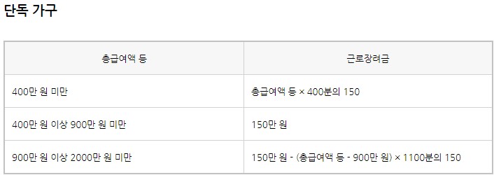 먼저 근로장려금 제도는 일은 하고 있지만 소득이 적은 가구에게 지원을 해주는 제도이기 때문에 소득에 대한 조건이 있습니다. 가구원 모두가 소유하고 있는 재산이 2억원 미만일 때만 신청이 가능한 점도 참고하시길 바랍니다. (부채는 차감하지 않습니다.)